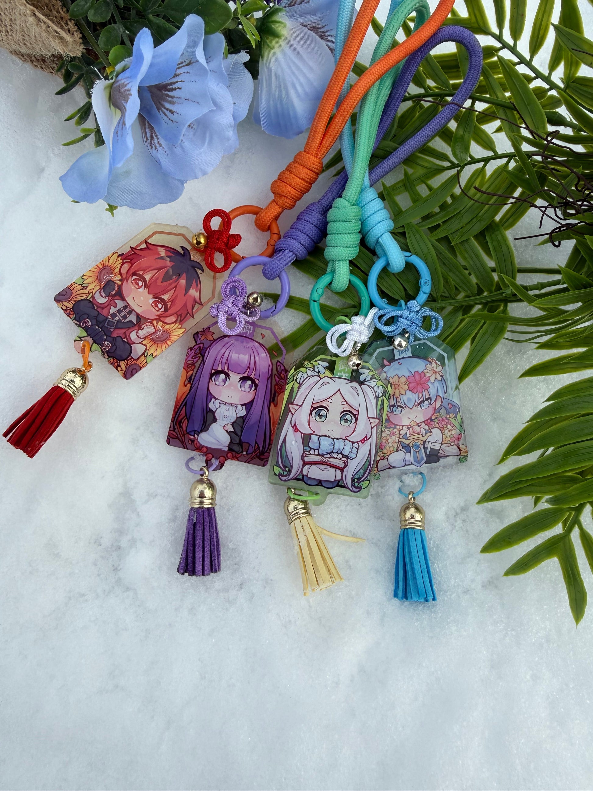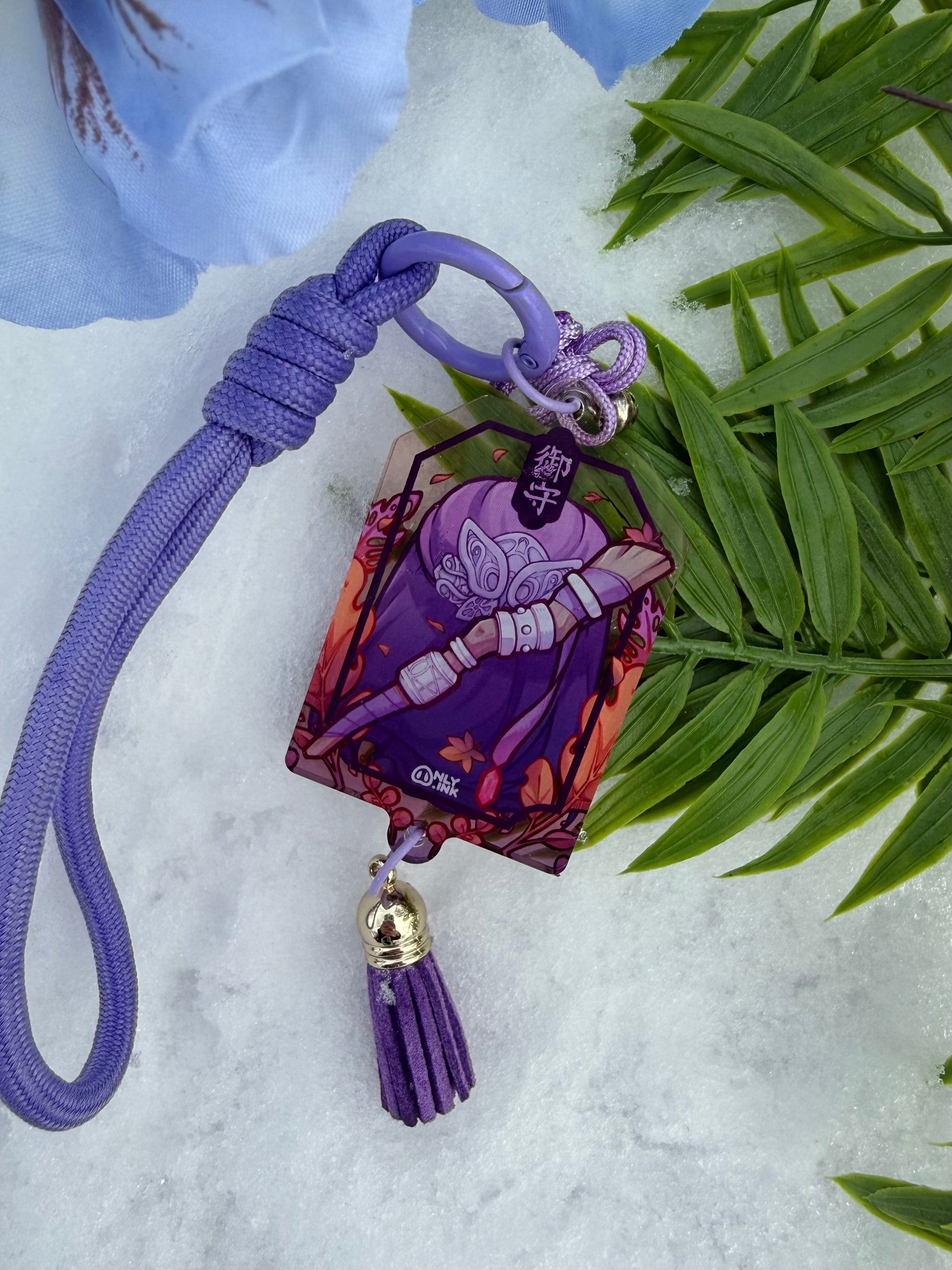 Llavero acrílico de 2.5" (63.5mm) con estética omamori (amuletos tradicionales japoneses), con accesorio colgante, lanyard de cuerda anudado, y nudo ume musubi hecho a mano y cascabel.